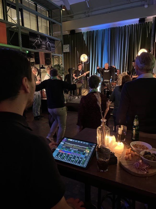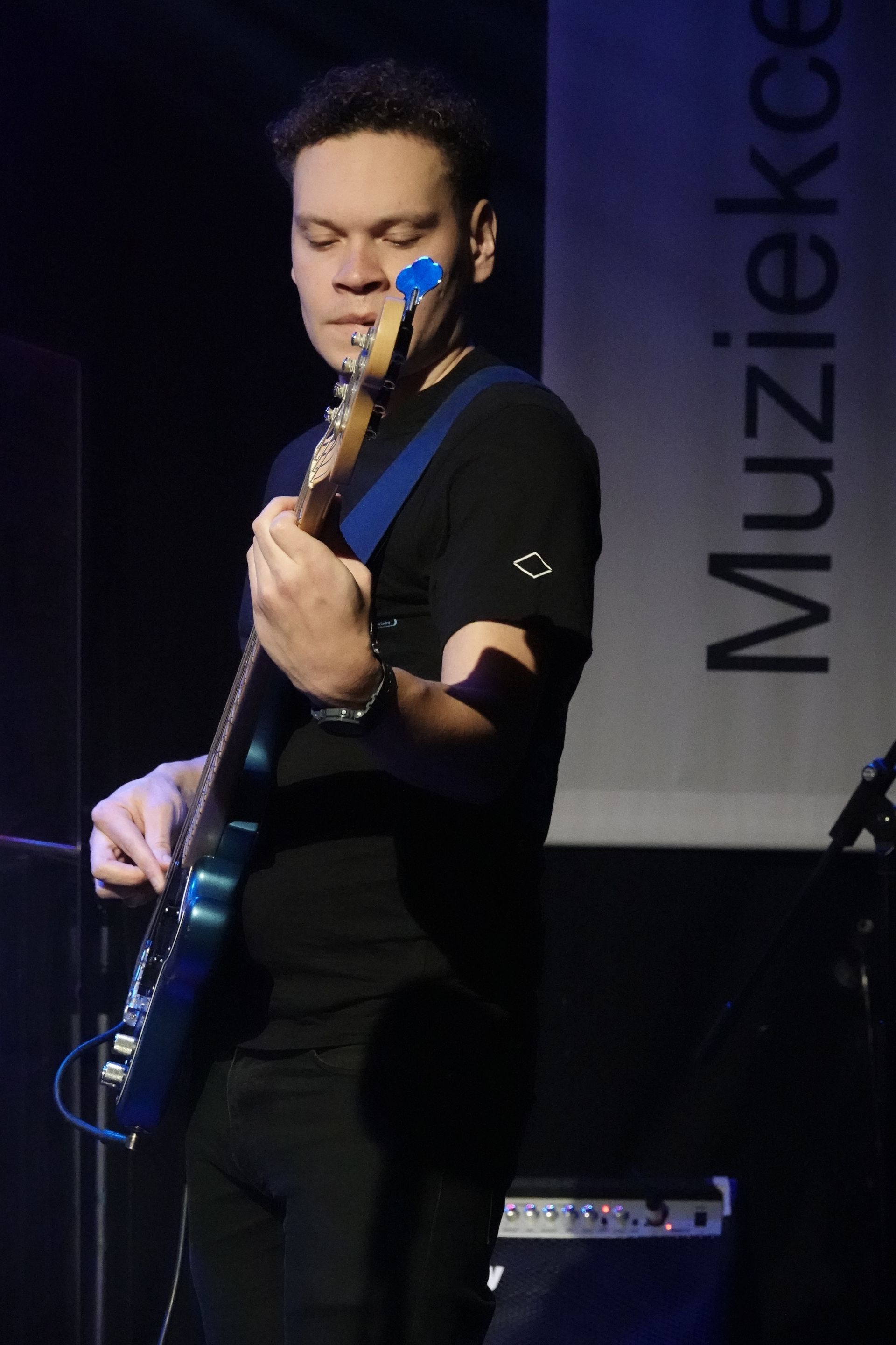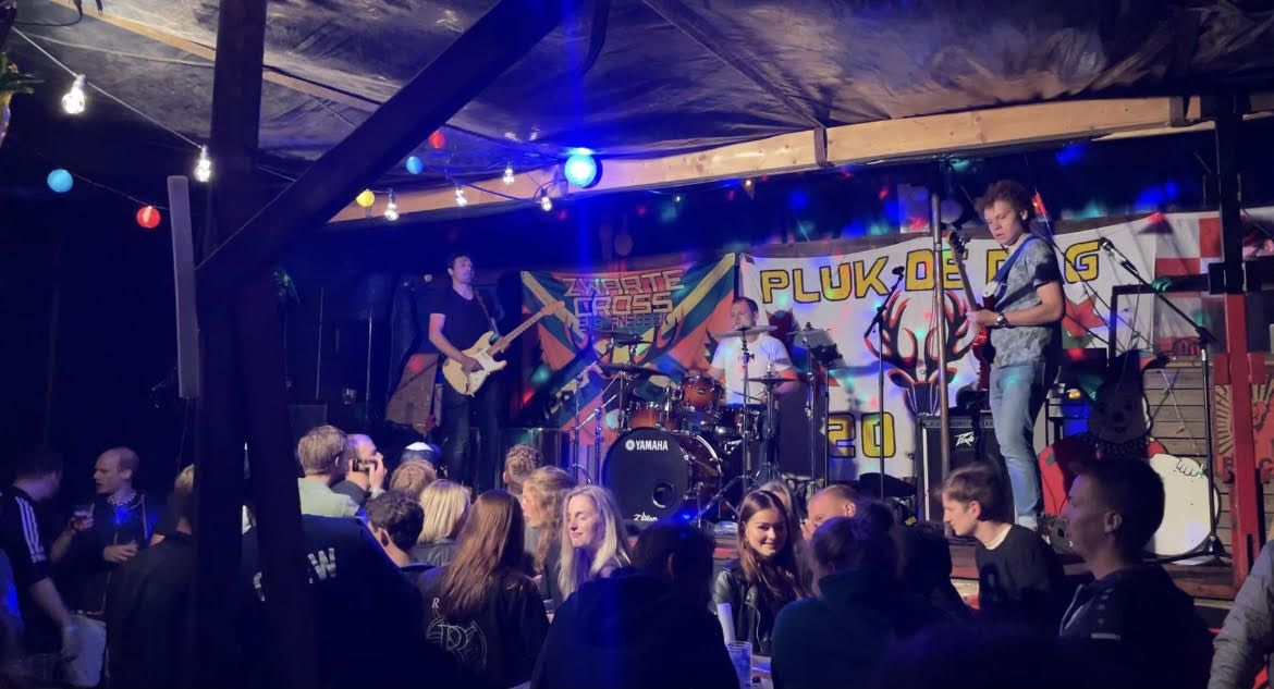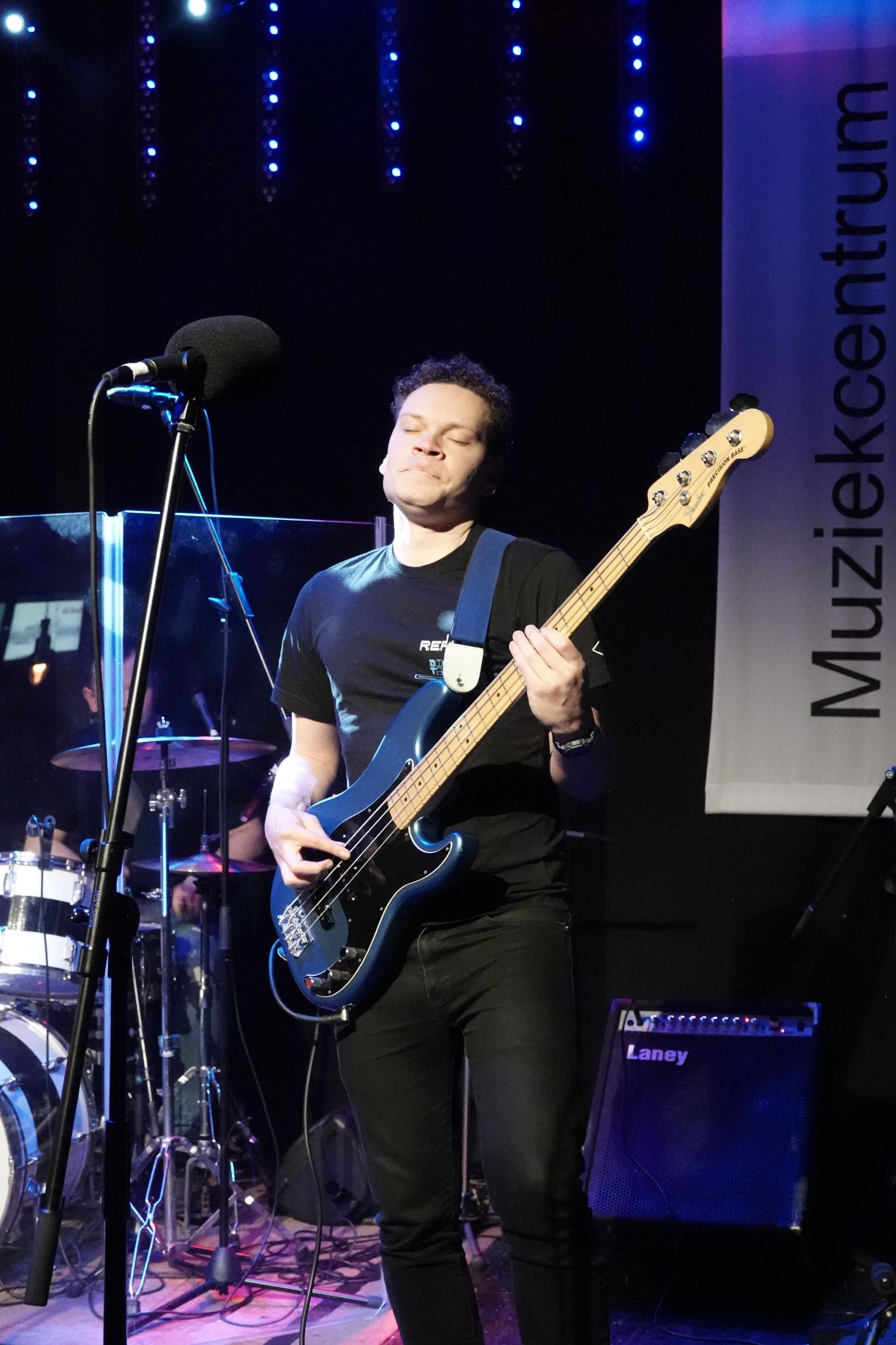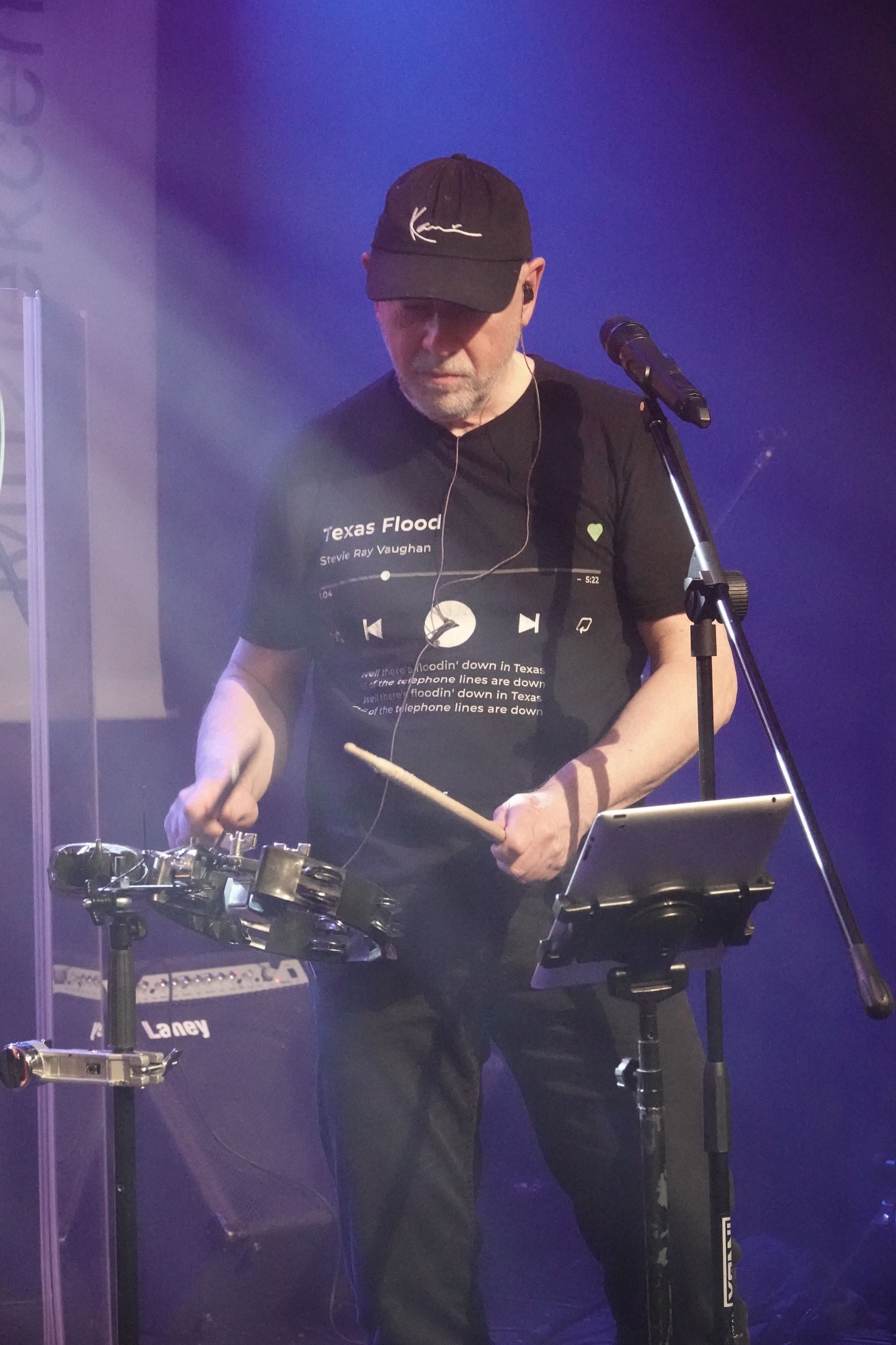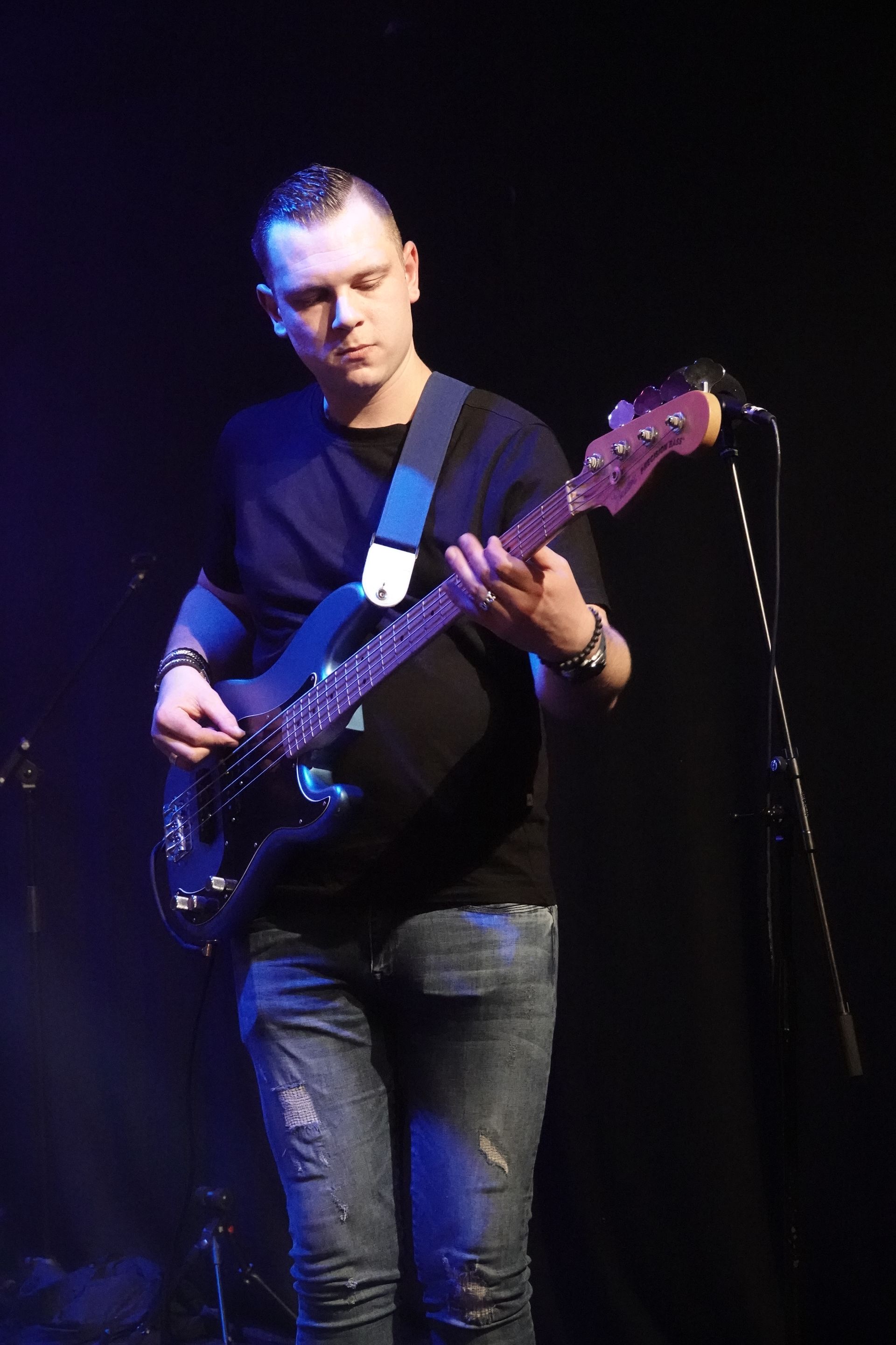 Stephan staat te bassen of z’n leven ervan af hangt en pompt met veel plezier zijn dragende en dreunende tonen over de aanwezigen heen. Lex zit zeer gedreven, robuust en slagvast ‘den trom te roeren’ , kan dan ook niet echt stilzitten en foefelt hier en daar een feilloos solootje door de nummers heen. Top. Beide mannen wisselen ook met het grootste gemak van instrument, das toch gewoon lol of nie dan.