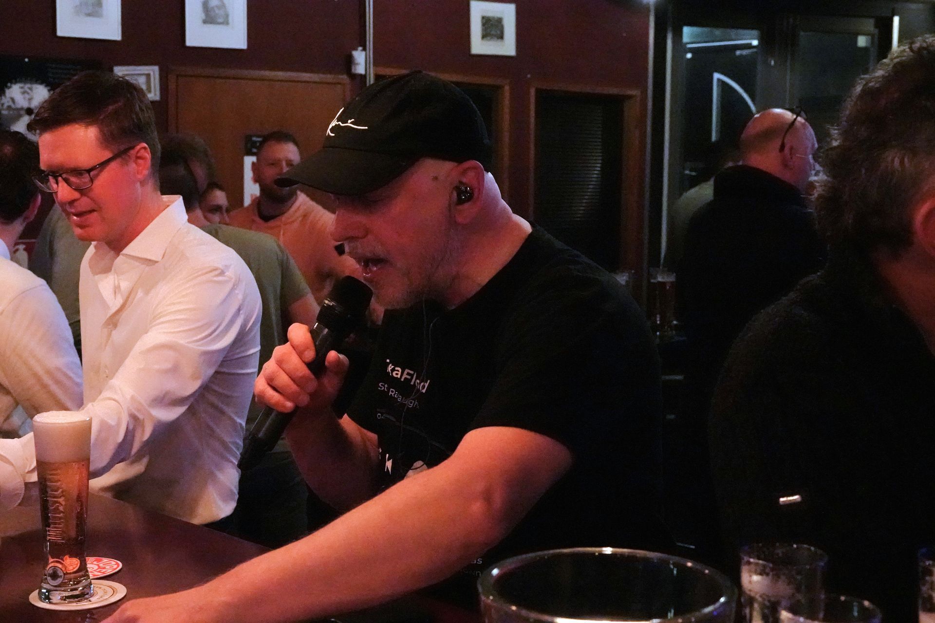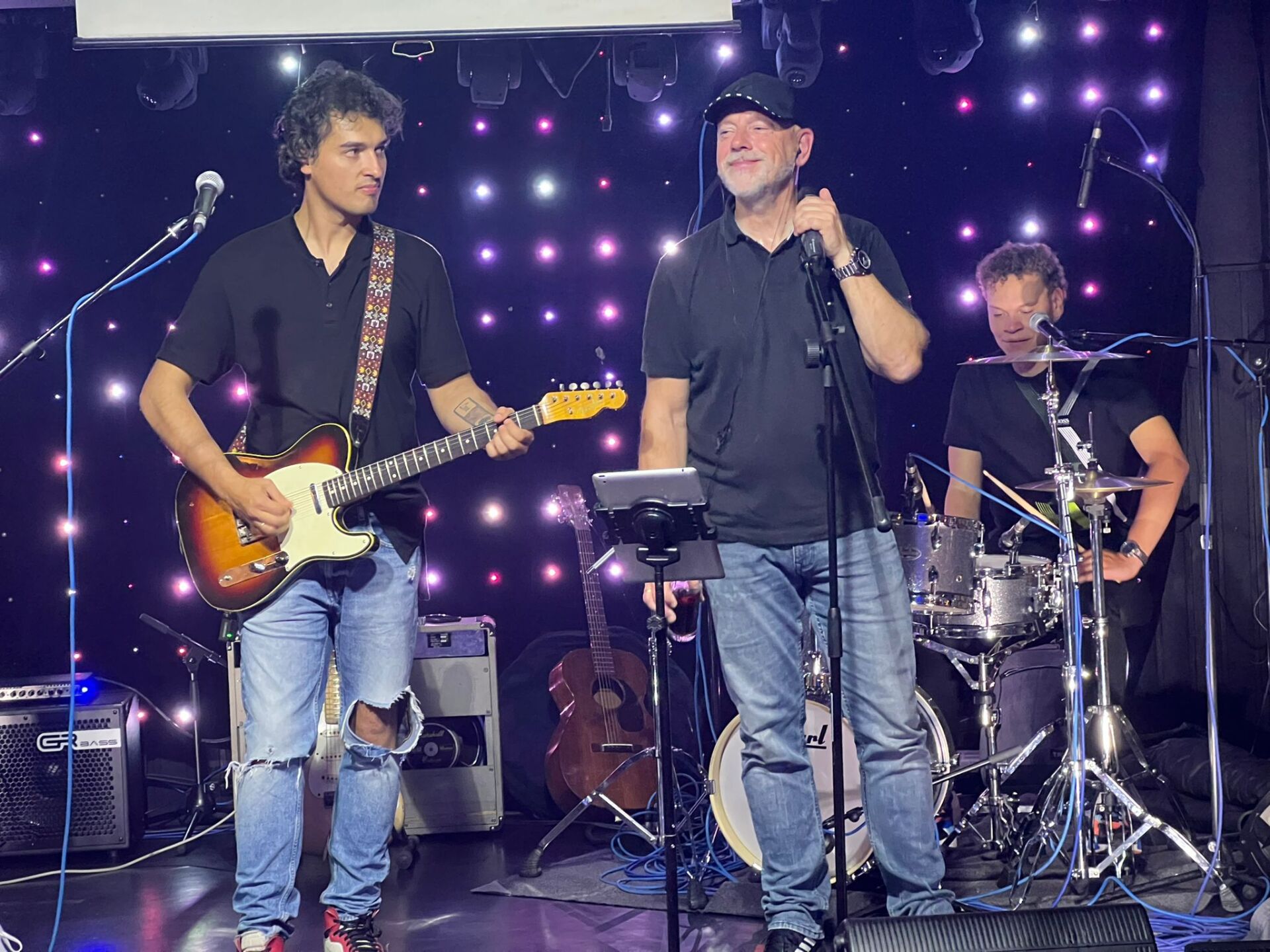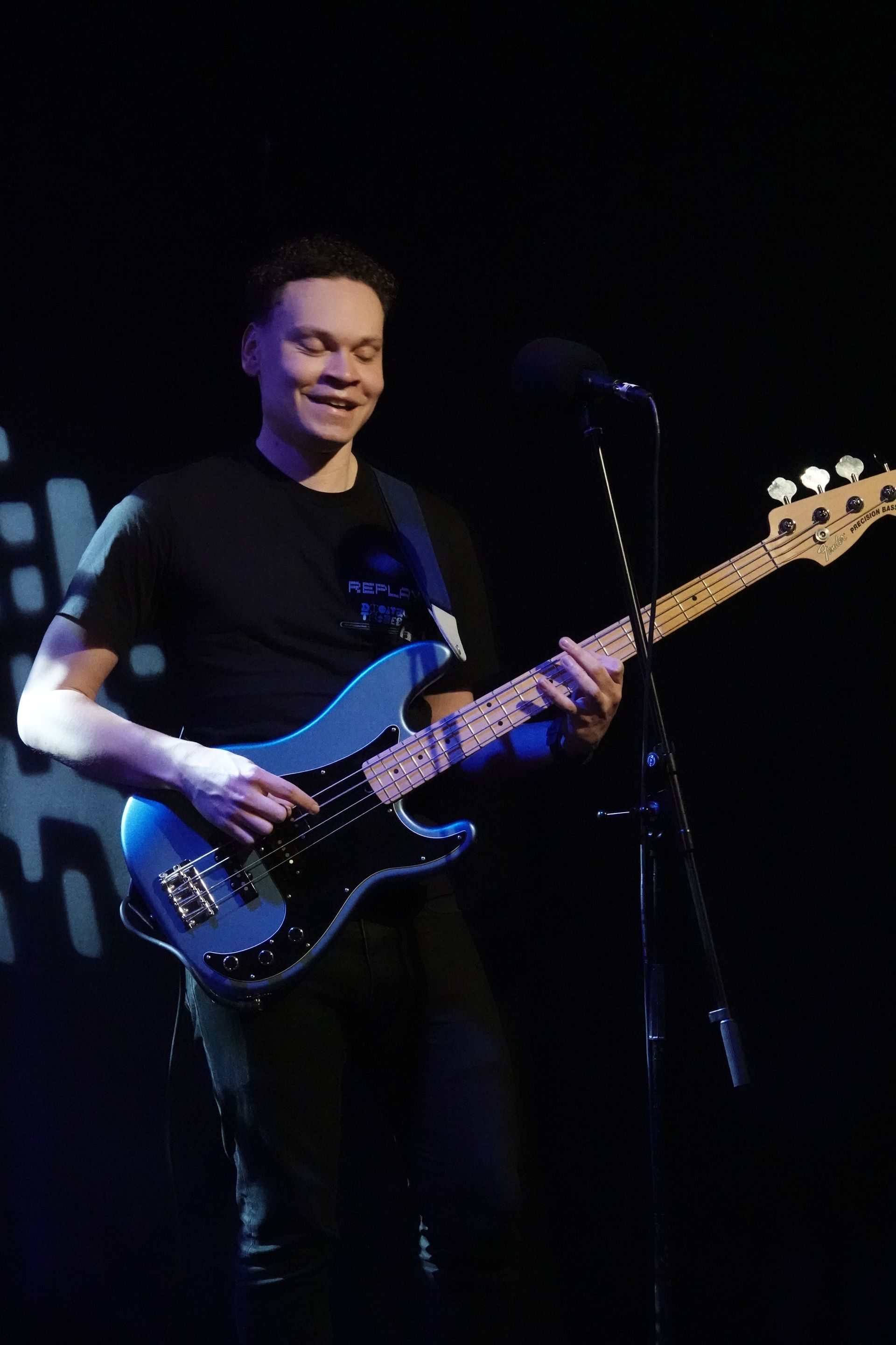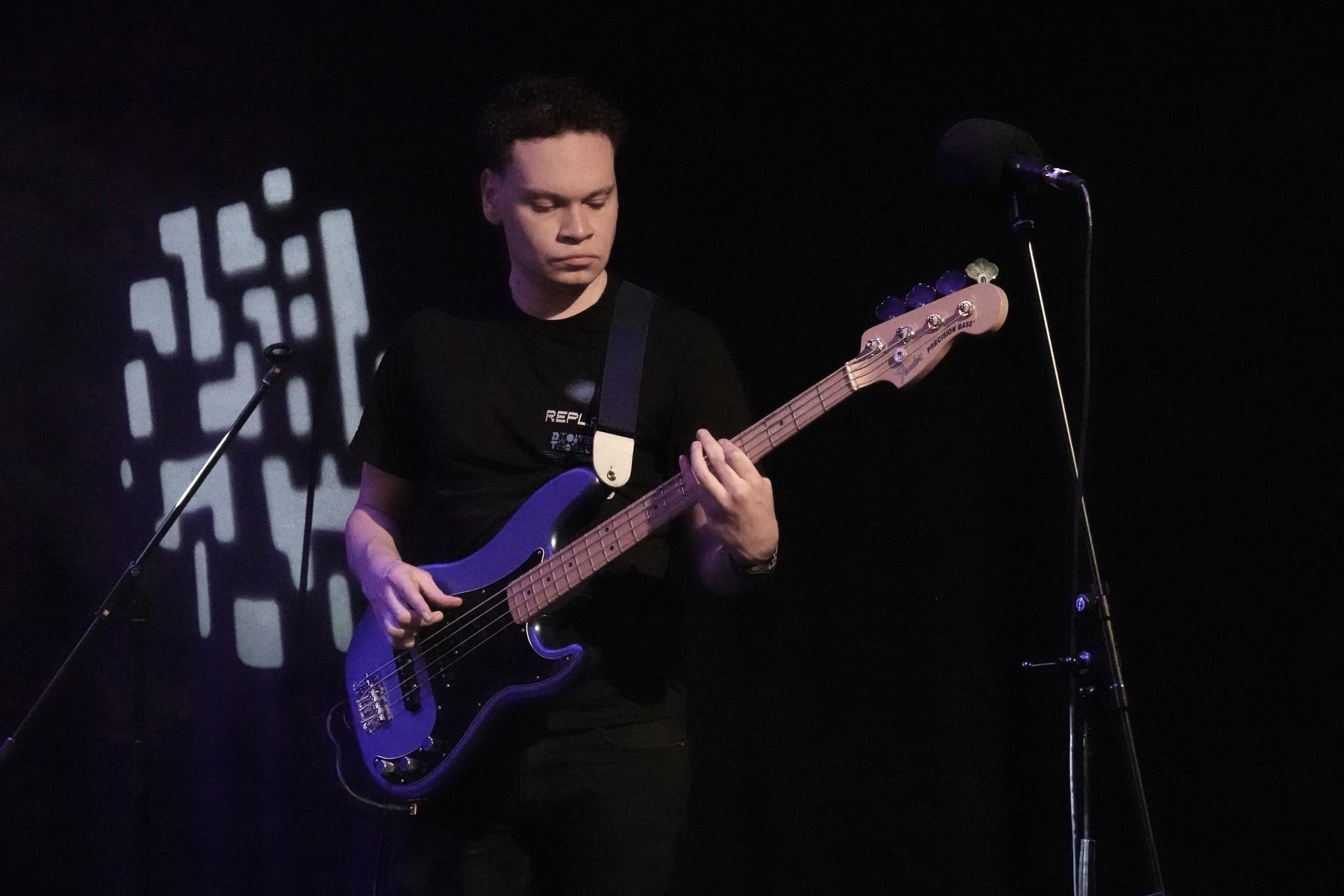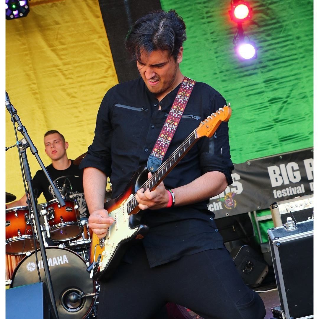 Stephan staat te bassen of z’n leven ervan af hangt en pompt met veel plezier zijn dragende en dreunende tonen over de aanwezigen heen. Lex zit zeer gedreven, robuust en slagvast ‘den trom te roeren’ , kan dan ook niet echt stilzitten en foefelt hier en daar een feilloos solootje door de nummers heen. Top. Beide mannen wisselen ook met het grootste gemak van instrument, das toch gewoon lol of nie dan.