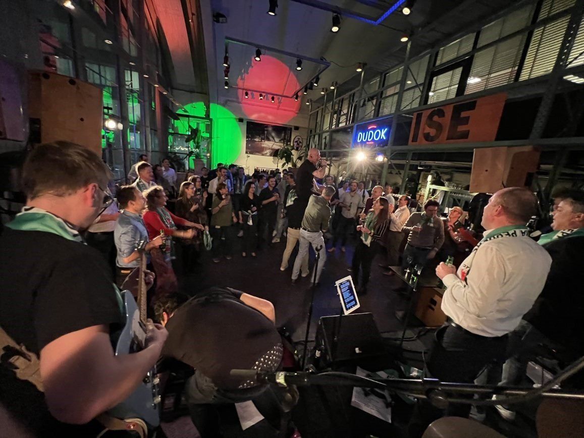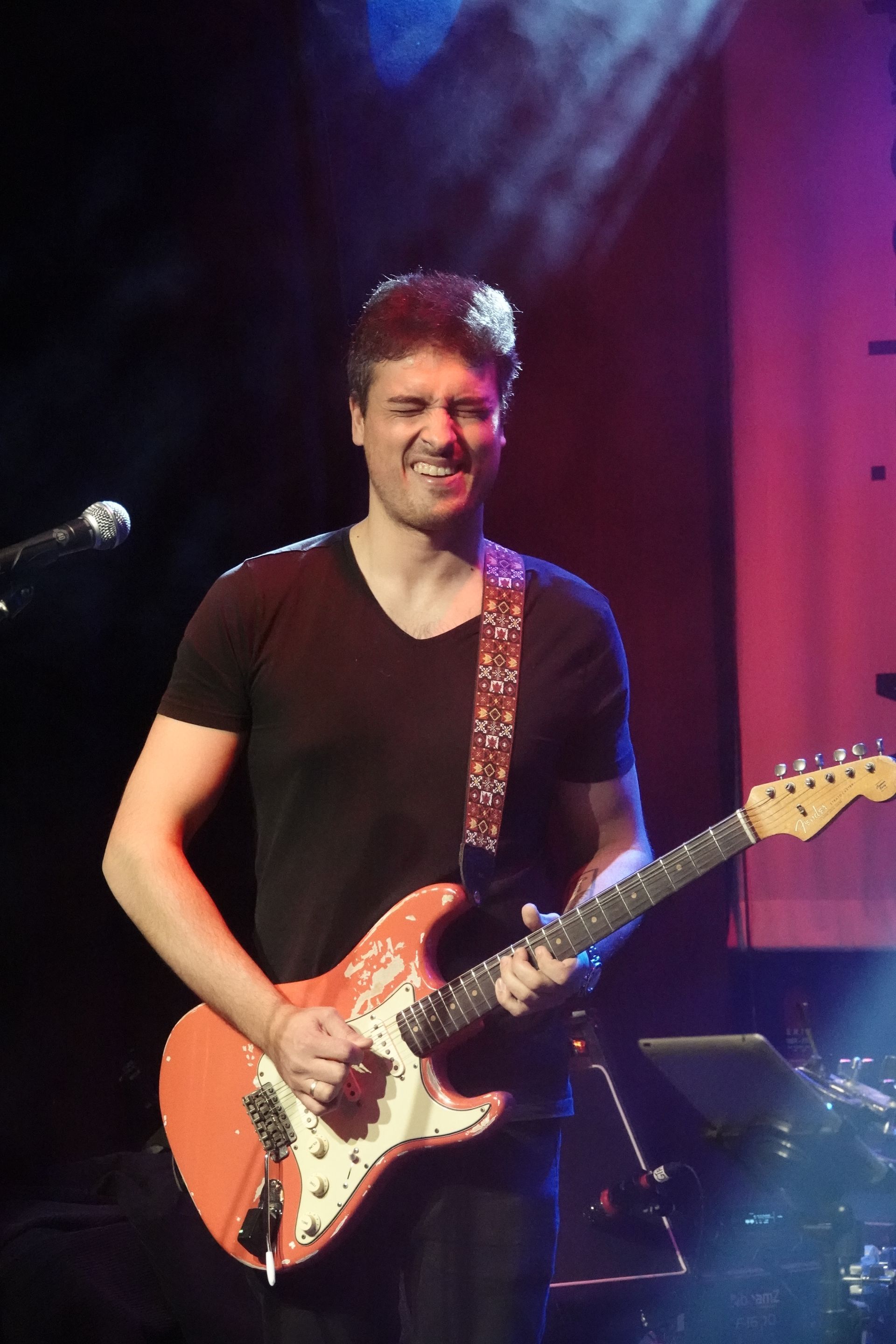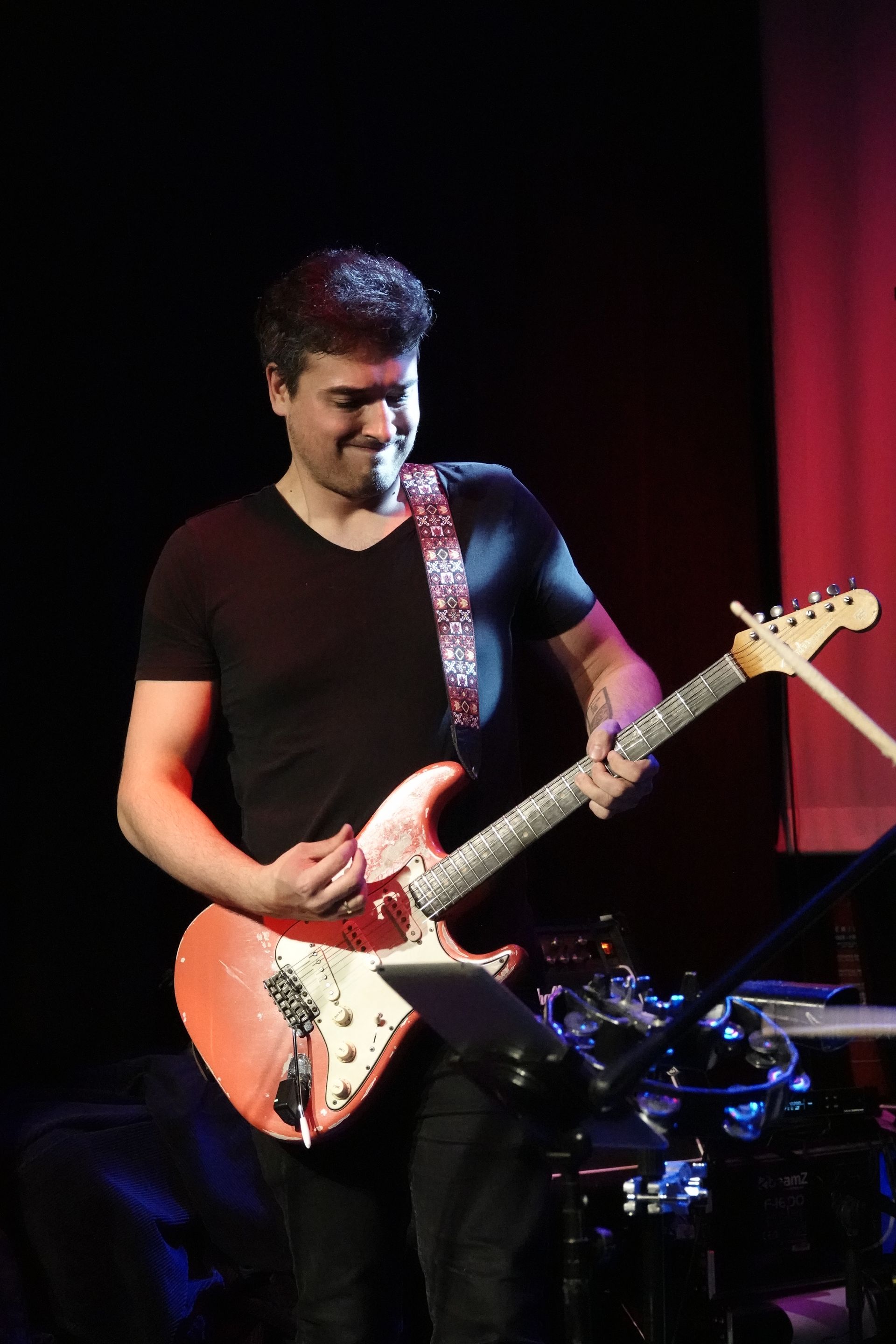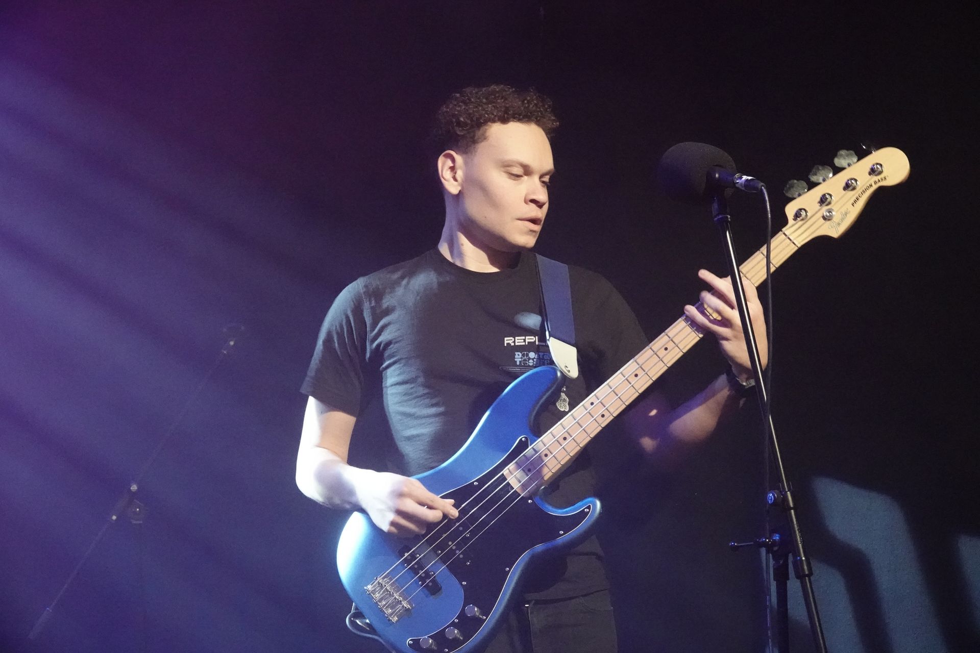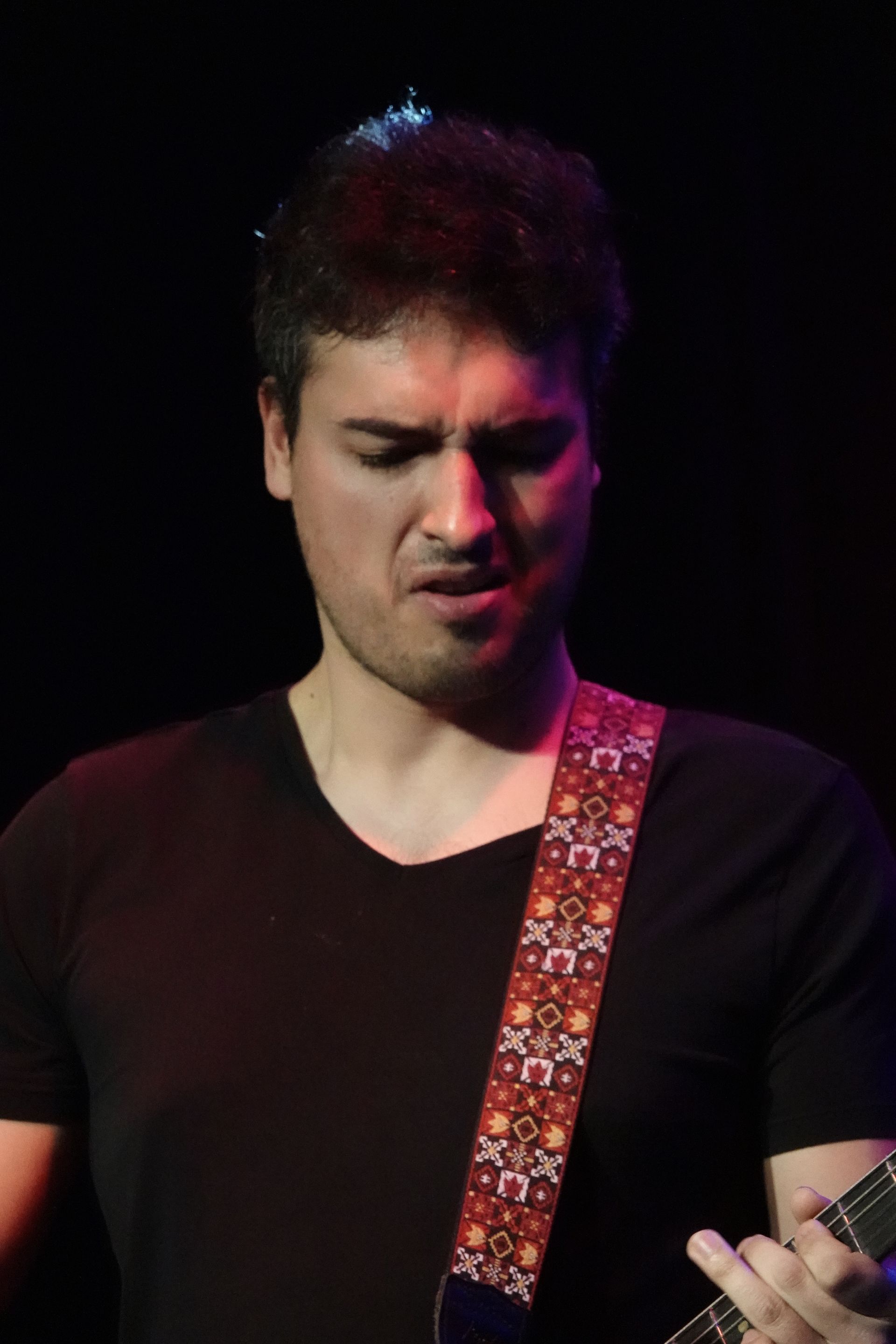 Stephan staat te bassen of z’n leven ervan af hangt en pompt met veel plezier zijn dragende en dreunende tonen over de aanwezigen heen. Lex zit zeer gedreven, robuust en slagvast ‘den trom te roeren’ , kan dan ook niet echt stilzitten en foefelt hier en daar een feilloos solootje door de nummers heen. Top. Beide mannen wisselen ook met het grootste gemak van instrument, das toch gewoon lol of nie dan.