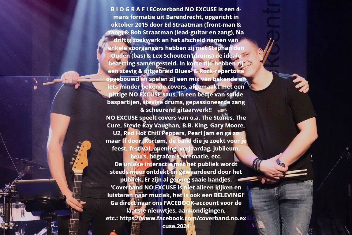 Met een uitstekend samengesteld repertoire van all-time Blues & Rock covers, gesudderd in een pittige No Excuse marinade gingen deze 4 muzikanten op niet mis te verstane manier los. Van Jimi Hendrix tot Herman brood en van Red Hot Chili Peppers tot The Cure, het kwam allemaal voorbij in een meer dan uitstekende show.